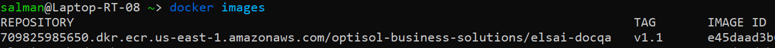 aws ecr get-login-password \ --region us-east-1 | docker login \ --username AWS \ --password-stdin 709825985650.dkr.ecr.us-east-1.amazonaws.comdocker pull 709825985650.dkr.ecr.us-east-1.amazonaws.com/optisol-business-solutions/elsai-docqa:v1.1